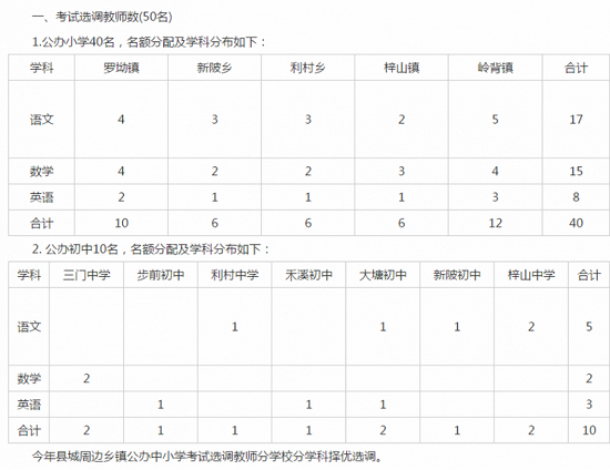 為緩解縣城周邊鄉(xiāng)鎮(zhèn)(羅坳、新陂、利村、梓山、嶺背5個(gè))中小學(xué)教師緊缺狀況,確保秋季順利開學(xué),經(jīng)研究決定,今年暑期面向全縣農(nóng)村中小學(xué)(含縣城民辦學(xué)校)考試選調(diào)50名教師到縣城周邊鄉(xiāng)鎮(zhèn)公辦中小學(xué)任教。為做好本次教師選調(diào)工作,特制定如下方案。