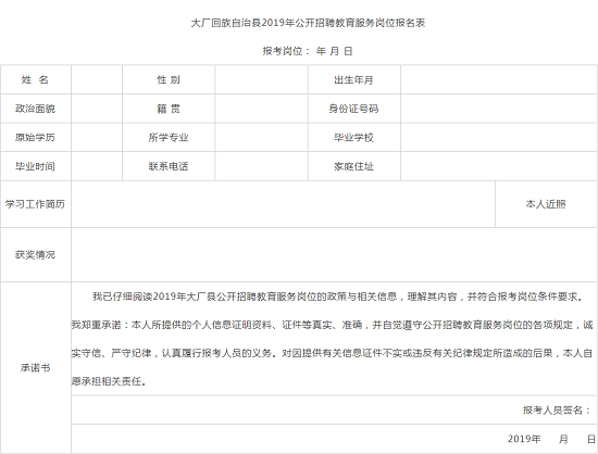 3.報(bào)名地點(diǎn):大廠回族自治縣教育和體育局四樓大會(huì)議室(大安西街133號(hào),咨詢電話;8822063)。現(xiàn)場(chǎng)報(bào)名,并填寫《報(bào)名表》。