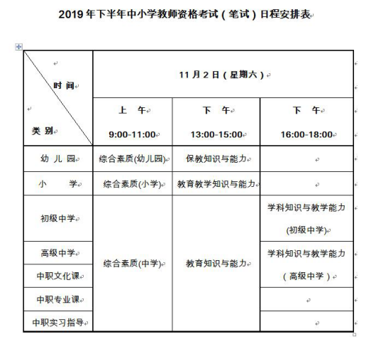 (三)2019年下半年面試報名時間:12月10-13日,面試日期:2020年1月4-5日,面試具體公告信息請于筆試成績公布后登錄中小學(xué)教師資格考試網(wǎng)(http://ntce.neea.edu.cn)。