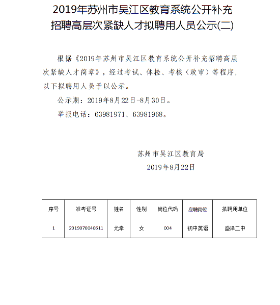 2019年蘇州市吳江區(qū)教育系統(tǒng)公開補(bǔ)充招聘高層次緊缺人才擬聘用人員公示 |