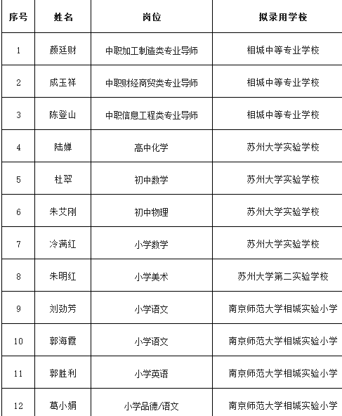 根據(jù)《2019年蘇州市相城區(qū)引進(jìn)骨干教師公告》、《2019年江蘇省相城中等專業(yè)學(xué)校引進(jìn)高層次緊缺人才(事業(yè)編制)公告》、《蘇州大學(xué)實(shí)驗(yàn)學(xué)校2019年補(bǔ)充引進(jìn)骨干教師簡章》規(guī)定,經(jīng)報名、面試、體檢、政審等程序,擬錄用以下12名同志,現(xiàn)予以公示,公示時間為5個工作日(8月28日—9月3日)。