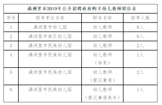 滿洲里市2019年公開招聘政府購買幼兒教師職位表
