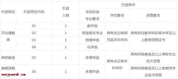 計(jì)劃為市體育運(yùn)動學(xué)校引進(jìn)文化課教師4名、摔跤教練1名及曲棍球教練1名,共6名。