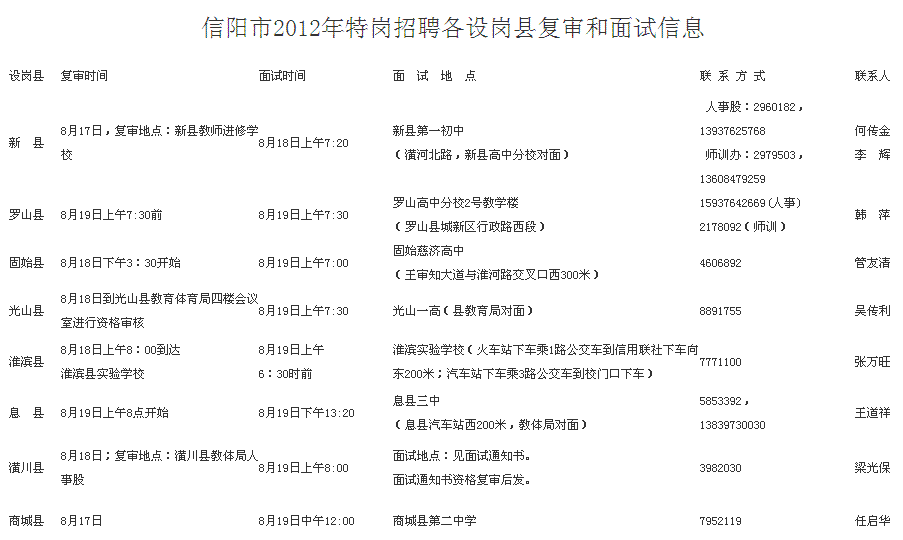 信陽市2012年特崗招聘各設(shè)崗縣復(fù)審和面試信息