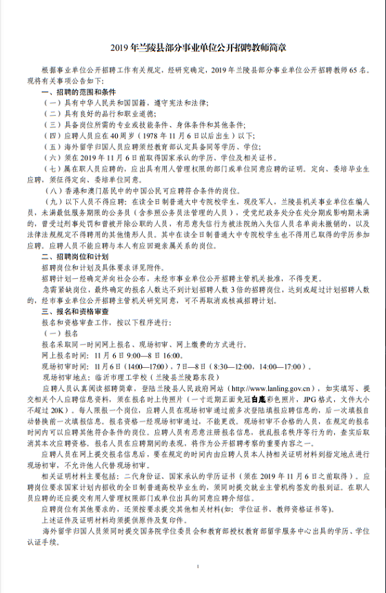 山東教師招聘 臨沂蘭陵縣2019年部分事業(yè)單位教師招聘【65人】