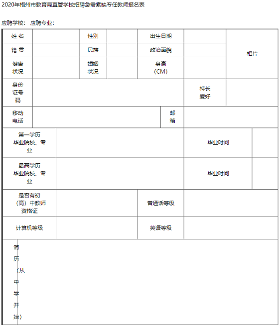1.2020年梧州市教育局直管學(xué)校招聘急需緊缺專任教師報名表