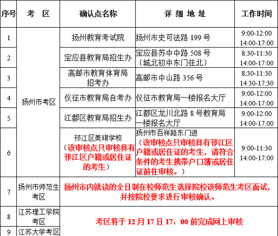 其他類別考生現(xiàn)場審核時間:2019年12月15日~17日17:00(揚(yáng)州市區(qū)上午9:00~12:00,下午14:00~17:00);
