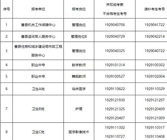 根據(jù)《2019年曹縣公開招聘事業(yè)單位工作人員簡章》“對棄權、考察或體檢不合格造成的空缺,可從進入同一崗位考察范圍的人員中依次等額遞補”的規(guī)定,現(xiàn)將人員遞補情況公告如下,如有異議,請來電咨詢0530-3398033。