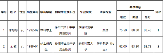 根據(jù)《2019年徐州市教育局直屬學(xué)校公開招聘教師公告2》的有關(guān)要求,以下同志經(jīng)招聘單位及其主管部門考察合格,擬聘用,現(xiàn)予以公示(公示時間2019年12月25日-2020年1月3日)。