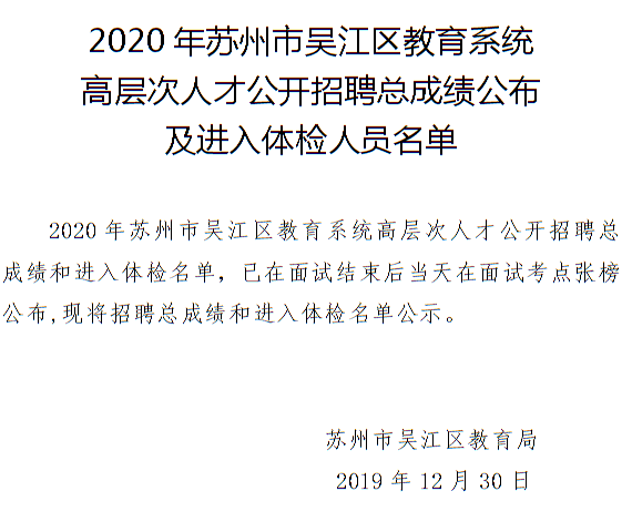 2020年江蘇教師招聘 蘇州市吳江區(qū)教育系統(tǒng)高層次人才公開招聘總成績公布及進入體檢人員名單