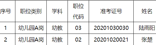 根據(jù)《張家港市公開招聘幼兒園備案制教師簡章》“擬錄用人員主動放棄錄用資格的,在報考同一職位的人員中,按考試成績總分從高分到低分依次遞補(bǔ)”的相關(guān)規(guī)定,現(xiàn)將遞補(bǔ)進(jìn)入體檢人員名單公告如下: