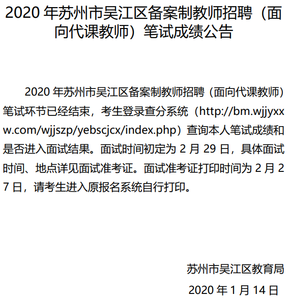 2020年蘇州市吳江區(qū)教師招聘筆試成績公告 歡迎加入蘇州教師招聘群;708022439 2020年蘇州市吳江區(qū)備案制教師招聘(面向代課教師)筆試成績公告 2020年蘇州市吳江區(qū)備案制教師公開招聘筆試成績公告 |