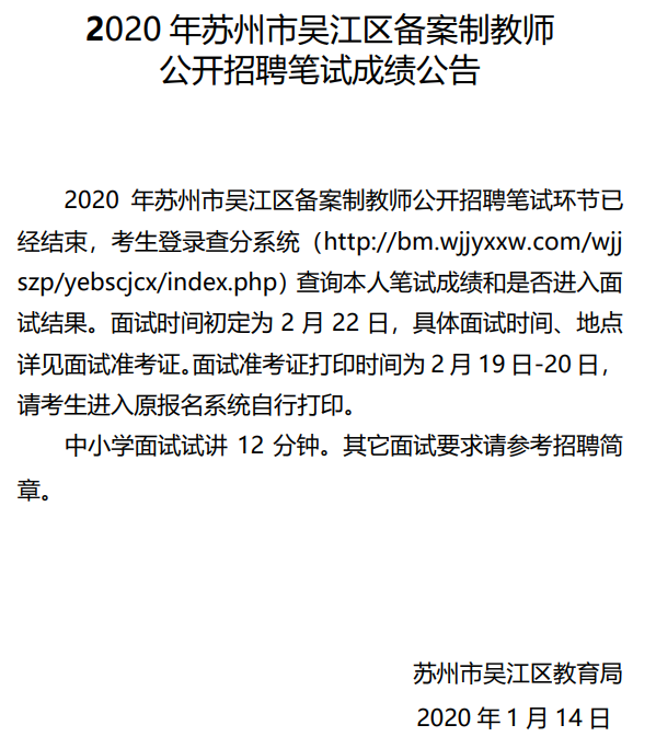 2020年蘇州市吳江區(qū)教師招聘筆試成績公告
