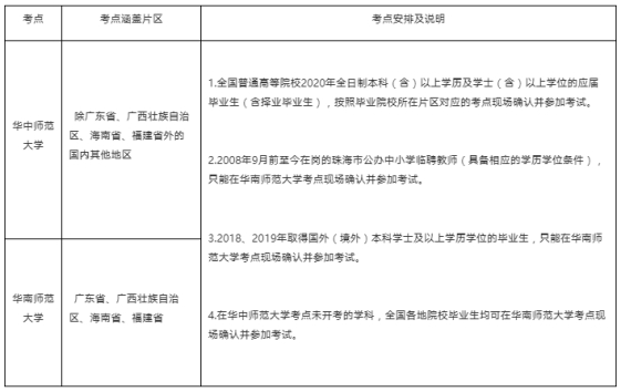 本次招聘在全國劃分兩個片區(qū),分別在武漢華中師范大學(xué)和廣州華南師范大學(xué)設(shè)置考點(diǎn)?忌荒茉谝粋考點(diǎn)參加考試?键c(diǎn)及考生安排見下表: