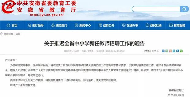 安徽教育廳!2020年中小學(xué)教師招聘考試正式推遲進(jìn)行