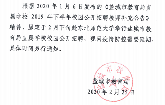 江蘇教師招聘 鹽城市教育局直屬學(xué)校2019年下半年校園公開招聘教師延期公告