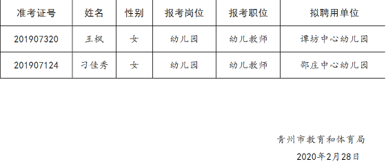 根據(jù)《青州市2019年公開(kāi)招聘中小學(xué)和幼兒園教師簡(jiǎn)章》及相關(guān)規(guī)定,考生王楓、刁佳秀因體檢時(shí)懷孕,體檢延期進(jìn)行,F(xiàn)經(jīng)補(bǔ)檢、考察均合格,擬聘用為控制總量備案制管理幼兒教師,現(xiàn)予以公示。公示時(shí)間自2020年2月28日至2020年3月9日(不含節(jié)假日)。