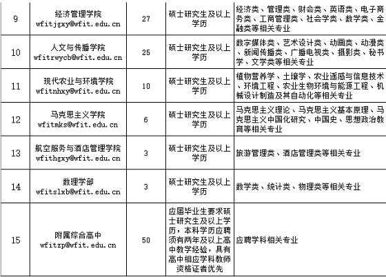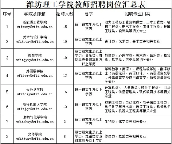 采取電子郵件方式報名,請應聘者下載并填寫《濰坊理工學院教職工應聘簡歷》,郵件標題格式“應聘崗位+姓名+畢業(yè)學校+學歷學位”,簡歷發(fā)至二級學院郵箱,郵箱地址詳見《教師招聘崗位匯總表》。