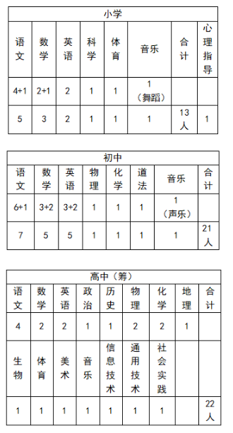 學校自2018年9月開始招生,現(xiàn)有小學兩個年級,初中兩個年級,現(xiàn)有在校生400余人,專職教師60人,具有高級職稱13人,研究生學歷24人,根據(jù)學校發(fā)展需要,擬補充部分學科教師,現(xiàn)面向社會公開招聘。