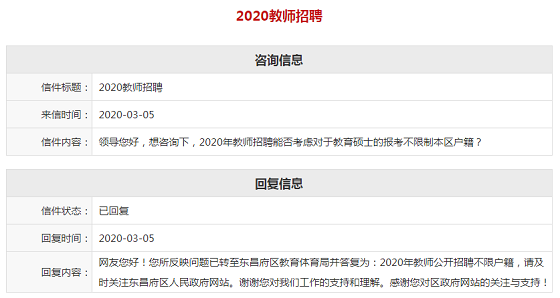 信件內(nèi)容:領(lǐng)導(dǎo)您好,想咨詢下,2020年教師招聘能否考慮對(duì)于教育碩士的報(bào)考不限制本區(qū)戶籍?