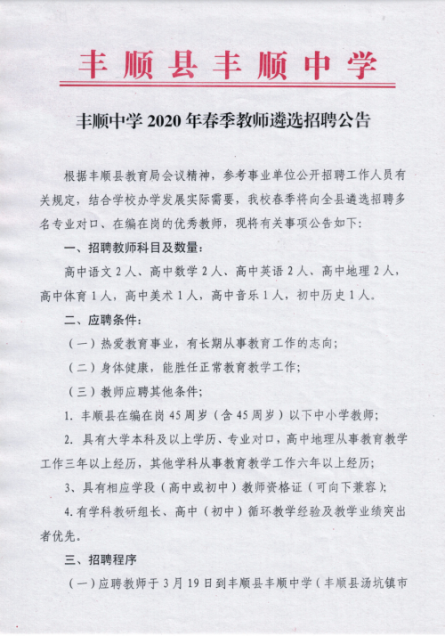 廣東梅州豐順中學(xué)2020年春季教師遴選招聘【12人】3月19日報(bào)名