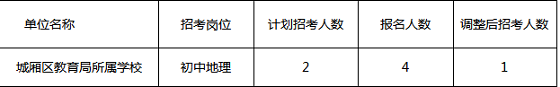 2020年公開招聘新任教師報名已結(jié)束,根據(jù)城廂區(qū)招聘方案“招考崗位的招考人數(shù)與報考人數(shù)的比例不足1︰3的,該崗位不開考,該崗位報考者的報名費將如數(shù)退還;崗位招考數(shù)較多,而報考者不足1︰3比例的,按1︰3等比例減少招考人數(shù)”規(guī)定,經(jīng)統(tǒng)計,現(xiàn)將2020年城廂區(qū)調(diào)整招考人數(shù)的初中地理崗位公告如下: