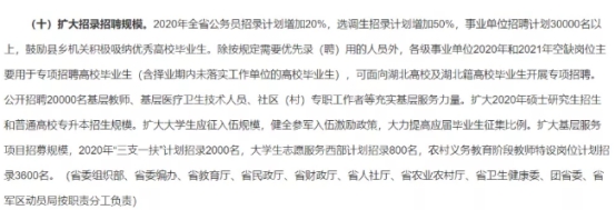 第十條政策:2020年全省公務(wù)員招錄計(jì)劃增加20%,選調(diào)生招錄計(jì)劃增加50%,事業(yè)單位招聘計(jì)劃30000名以上,鼓勵(lì)縣鄉(xiāng)機(jī)關(guān)積極吸納優(yōu)秀高校畢業(yè)生。除按規(guī)定需要優(yōu)先錄(聘)用的人員外,各級事業(yè)單位2020年和2021年空缺崗位主要用于專項(xiàng)招聘高校畢業(yè)生(含擇業(yè)期內(nèi)未落實(shí)工作單位的高校畢業(yè)生),可面向湖北高校及湖北籍高校畢業(yè)生開展專項(xiàng)招聘。