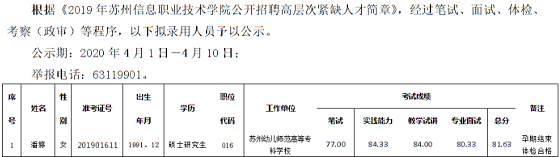 2019年江蘇教師招聘 蘇州信息職業(yè)技術(shù)學(xué)院高層次緊缺人才公開招聘難擬錄用人員公示(二)