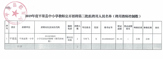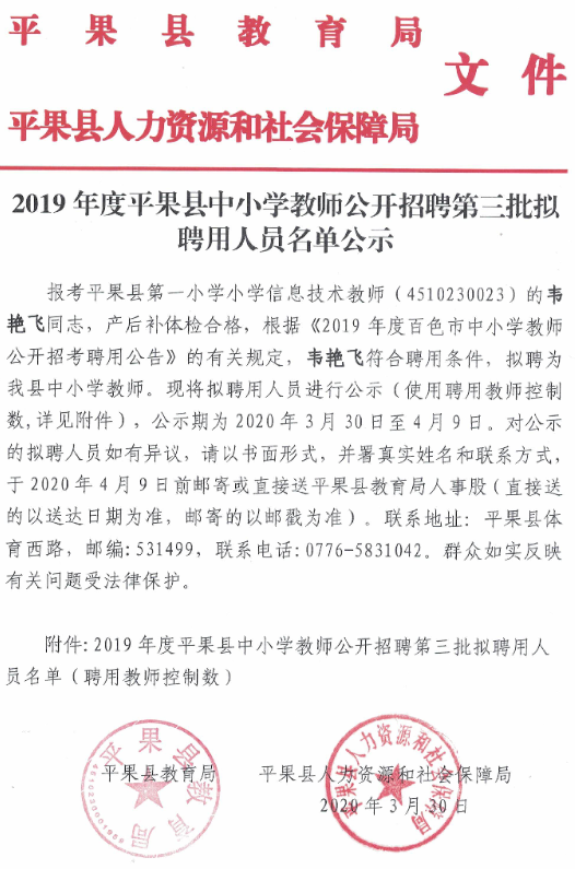 廣西教師招聘 百色平果縣2019年中小學(xué)教師招聘第三批擬聘用人員名單公示