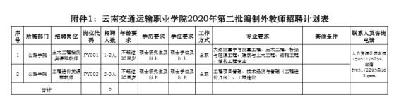附件1:云南交通運(yùn)輸職業(yè)學(xué)院2020年第二批編制外教師招聘計(jì)劃表