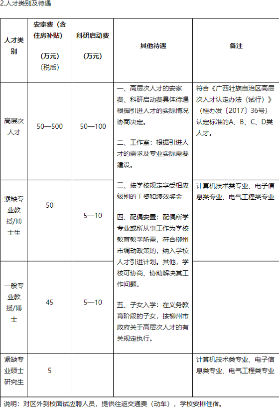 注:除以上待遇外,同時(shí)享受柳州市政府、市教育局給引進(jìn)人員的獎(jiǎng)勵(lì)政策,學(xué)校按柳州市政府、市教育局相關(guān)文件執(zhí)行。