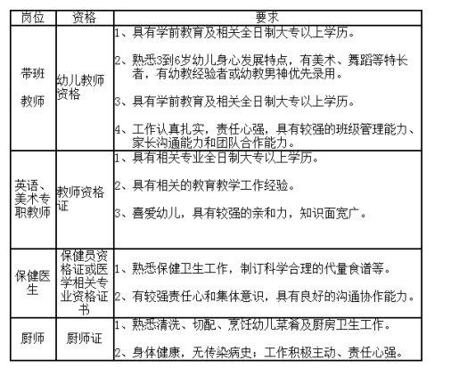 3、幼兒園將依據(jù)個(gè)人職業(yè)規(guī)劃量才使用,安排省內(nèi)外專業(yè)培訓(xùn),具有發(fā)展空間。