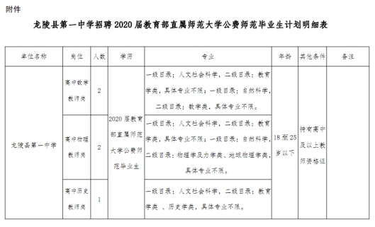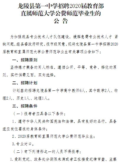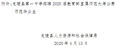 云南保山市龍陵縣第一中學(xué)2020年公費(fèi)師范生招聘公告,報(bào)名時(shí)間為4月16日9:00-18:00