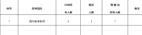 北岸開(kāi)發(fā)區(qū)2020年公開(kāi)招聘中小學(xué)幼兒園新任教師報(bào)名已結(jié)束,因高中數(shù)學(xué)教師招考崗位招考人數(shù)與報(bào)考者比例不足1:3,根據(jù)我區(qū)2020年公開(kāi)招聘中小學(xué)幼兒園新任教師方案規(guī)定,現(xiàn)對(duì)高中數(shù)學(xué)教師崗位招考人數(shù)按1:3比例進(jìn)行調(diào)整,具體如下:
