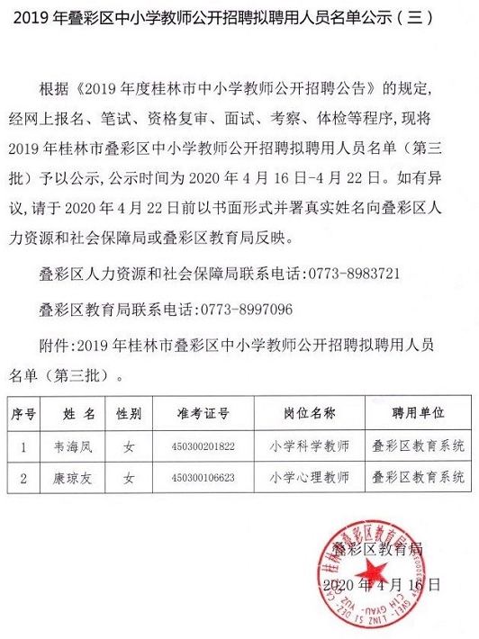 廣西教師招聘 桂林疊彩區(qū)中小學(xué)2019年公開(kāi)教師招聘擬聘用人員名單公示