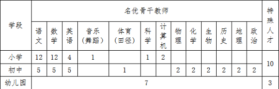 為推進(jìn)人才強(qiáng)區(qū)、人才興教戰(zhàn)略,實(shí)施名師工程,經(jīng)研究決定面向社會(huì)公開(kāi)選聘特殊人才和名優(yōu)骨干教師80名,其中特殊人才13名(含幼兒園3名),名優(yōu)骨干教師67名(含幼兒園教師7名、小學(xué)教師32名、初中教師28名)。