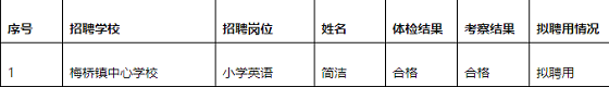 報(bào)考梅橋鎮(zhèn)中心學(xué)校小學(xué)英語(yǔ)崗位的簡(jiǎn)潔,因懷孕造成體檢時(shí)婦、DR兩個(gè)項(xiàng)目未檢,依據(jù)有關(guān)文件規(guī)定,延期體檢,F(xiàn)簡(jiǎn)潔孕期結(jié)束,本人提出體檢申請(qǐng),該考生體檢、考察均合格,擬聘用,F(xiàn)將延期體檢人員體檢、考察結(jié)果及擬聘用情況公示如下: