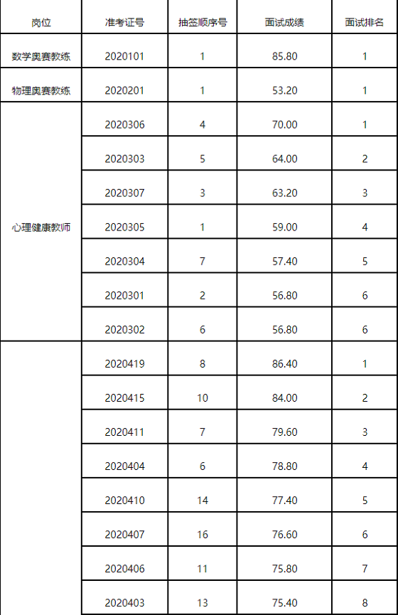 根據(jù)《2020年宜昌市教育局所屬事業(yè)單位急需緊缺人才引進實施方案》和《2020年宜昌市葛洲壩中學急需緊缺人才引進面試工作方案》安排,現(xiàn)將面試成績公布如下: