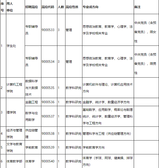 我校2020年碩士層次人才招聘計劃共計21人,在此之前發(fā)布的預(yù)招聘公告中的崗位及計劃數(shù)均以下表為準(zhǔn):