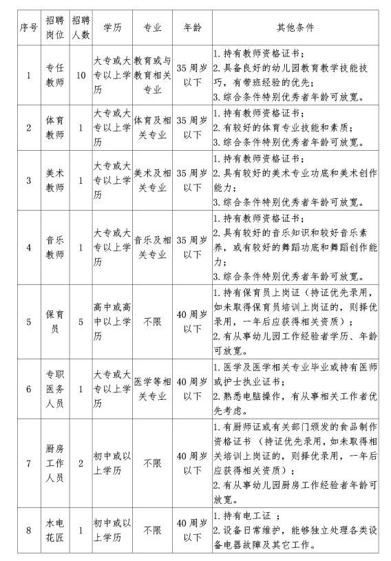 1.中心幼兒園招聘崗位、人數(shù)及專業(yè)條件