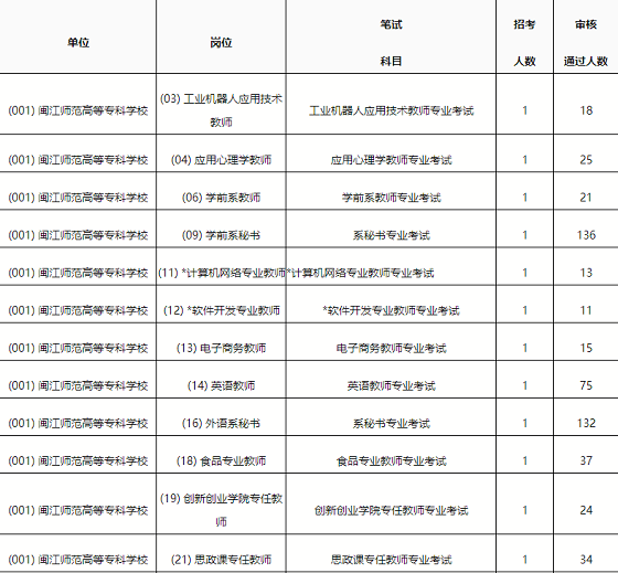 閩江師范高等?茖W(xué)校2020年公開(kāi)招聘工作人員網(wǎng)上報(bào)名、資格初審工作已結(jié)束。此次報(bào)考中,共有15個(gè)學(xué)歷要求為研究生的崗位報(bào)考審核通過(guò)人數(shù)與招收人數(shù)比例在10:1以上,需先進(jìn)行筆試,再按規(guī)定比例進(jìn)入面試,F(xiàn)將具體崗位公告如下: