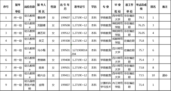 經(jīng)報(bào)名、筆試、資格復(fù)審、面試、體檢、政審等環(huán)節(jié),擬確定曹依婷等9名同志為涼山州機(jī)關(guān)第一幼兒園工作人員,現(xiàn)將擬聘用人員名單按總成績(jī)從高分到低分公示如下: