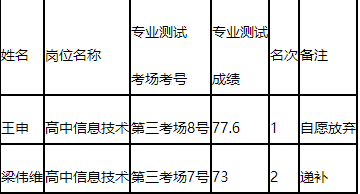 安徽省寧國中學(xué)2020年公開招聘教師體檢、考察過程中,因“高中信息技術(shù)”崗位一名考生放棄體檢、考察資格,該崗位出現(xiàn)1名缺額。根據(jù)《安徽省寧國中學(xué)2020年公開招聘教師公告》規(guī)定,現(xiàn)予以遞補(bǔ),F(xiàn)將“高中信息技術(shù)”崗位遞補(bǔ)體檢、考察人員名單公示如下: