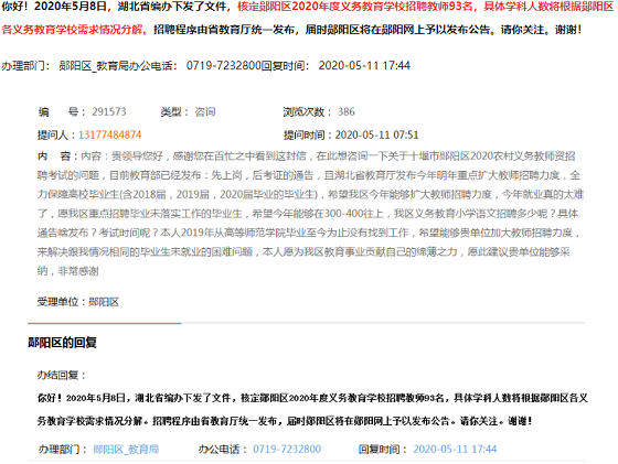 官方回復(fù):湖北十堰鄖陽(yáng)區(qū)2020年度義務(wù)教育學(xué)校招聘教師93名