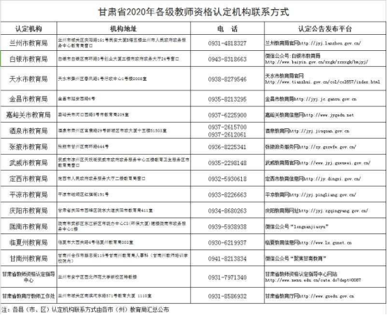 附件:甘肅省2020年各級教師資格認定機構(gòu)聯(lián)系方式