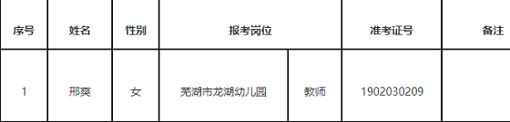 根據(jù)三山區(qū)教育局、三山區(qū)人力資源和社會保障局《2019年三山區(qū)公開招聘公辦幼兒園工作人員公告》規(guī)定,考生邢爽完成筆試、專業(yè)測試等程序,由于當時正處在懷孕期,未能完成體檢,F(xiàn)該考生已完成體檢、考察等程序,體檢合格,考察合格,予以公示。