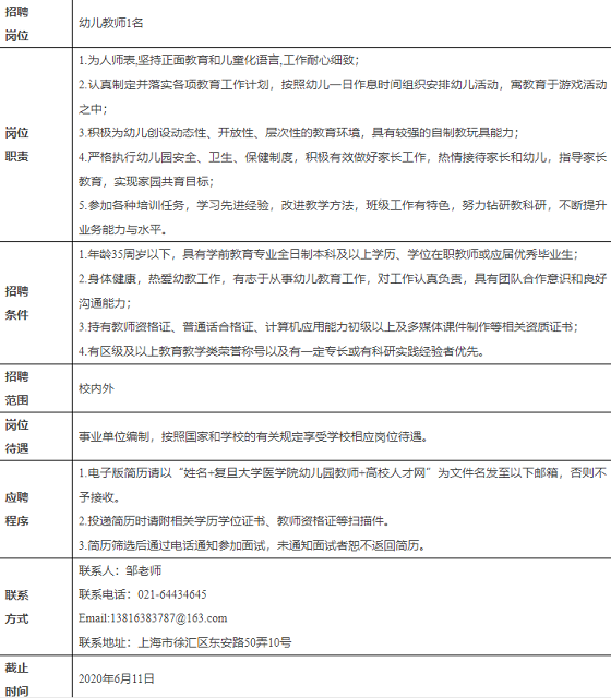 上海教師招聘 復(fù)旦大學(xué)醫(yī)學(xué)院幼兒園2020年5月招聘幼兒教師【1名】