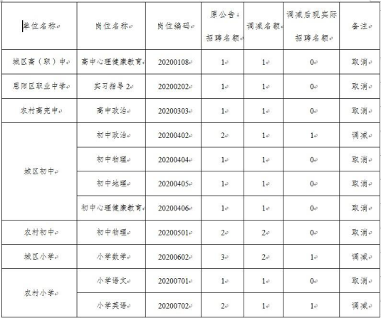 四川巴中市恩陽區(qū)2020年公開招聘中小學(xué)教師調(diào)減部分招聘崗位名額的公告