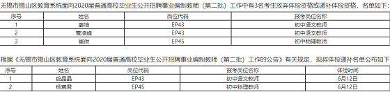 無錫市錫山區(qū)教育系統(tǒng)面向2020屆普通高校畢業(yè)生公開招聘事業(yè)編制教師(第二批)體檢遞補(bǔ)考生公告(二)