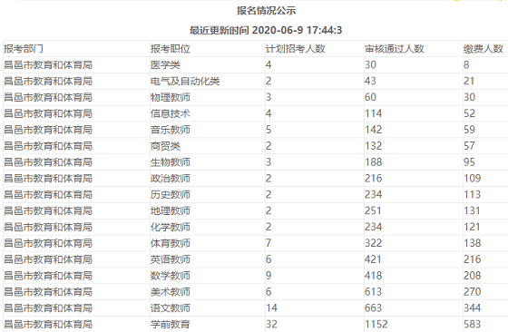 山東濰坊昌邑市2020年教師招聘105人報名情況公示(截至6月9日17:44)